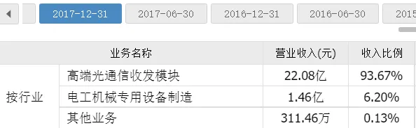 从财报看,2016年公司营收仅1.32亿元,全部来自电工机械专用设备制造。2017年,重组完成,公司更名为“中际旭创”。2017年公司营收呈现爆发式增长,全年光通信收发模块营收达22亿元,传统的电工机械专用设备制造仅1.46亿元。