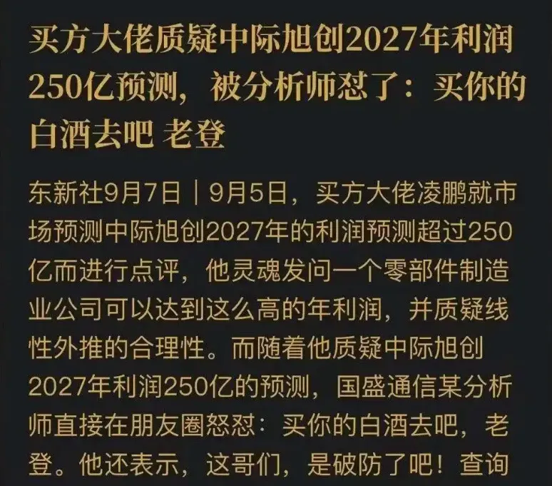随着中际旭创股价越涨越高,投资者分歧也公开化。去年9月,荒原投资董事长凌鹏曾公开质疑市场对中际旭创2027年净利润超过250亿元的预测;他认为光模块属于制造业,终将面临产能扩张、价格战与利润回落,当前估值严重透支未来。对此,国盛证券某卖方分析师曾怒怼“买你的白酒去吧,老登”,引发争议…….