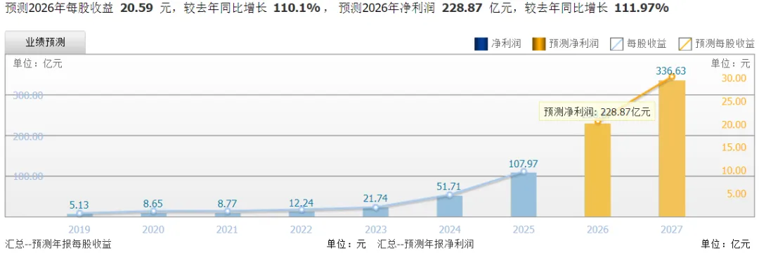 根据同花顺数据,6个月内有33家机构做出2026年度业绩预测,其中净利润一致性预期是228.87亿元,同比增长111.97%。这个数据对比“提前发布一季报”这一动作来看,气氛都烘托到这里了,那么一季度超预期应该是十有八九了。