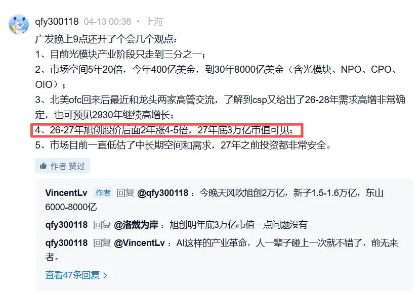 网上还流传出广发券商交流会,内部给出了2027年底中际旭创3万亿市值的目标。