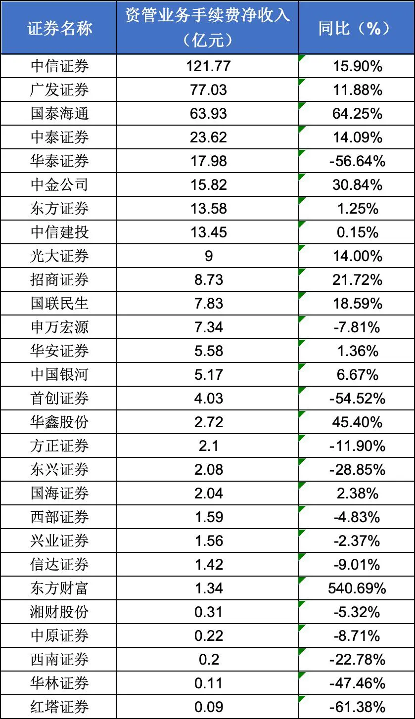 此外,西南证券、华林证券、红塔证券的资管业务手续费净收入均低于2000万元,分别较上年下滑22.78%、47.46%、61.38%。