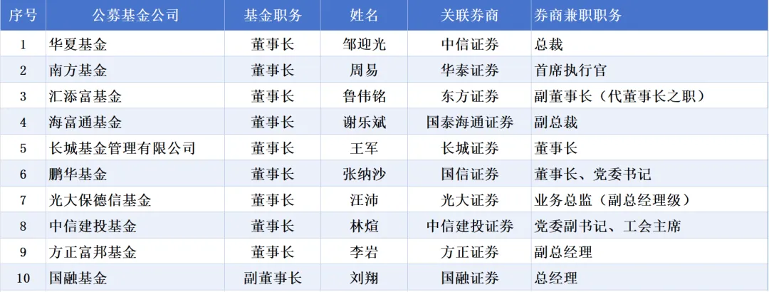 如果仅仅是个例,那追浪不用单拿出一篇稿子来讲,通过本浪不完全梳理发现,至少有10余家券商系公募基金目前存在类似兼任情况: