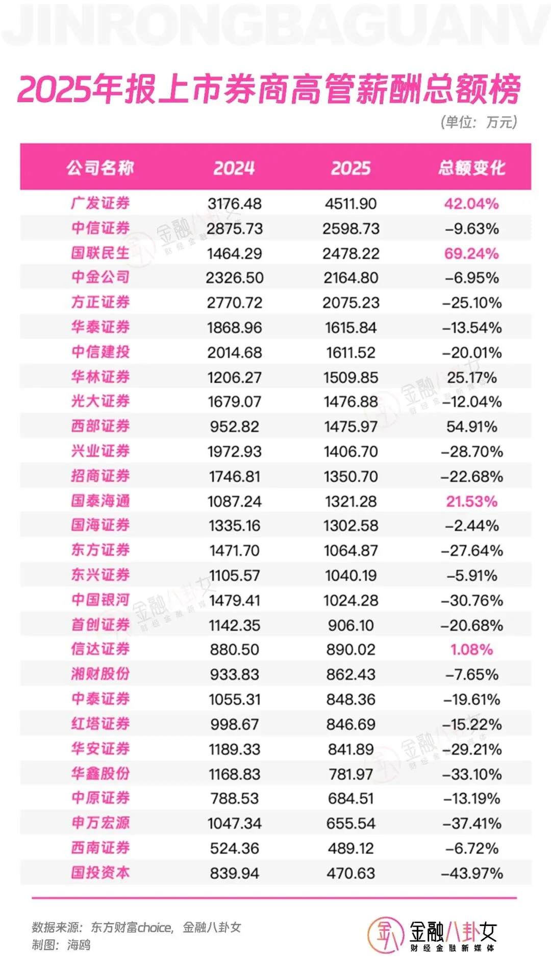 年报显示,多数上市券商的高管薪酬总额都在大幅下降。28家已发布年报的上市券商,2024年的高管薪酬总额合计4.11亿,2025年降到了3.83亿。