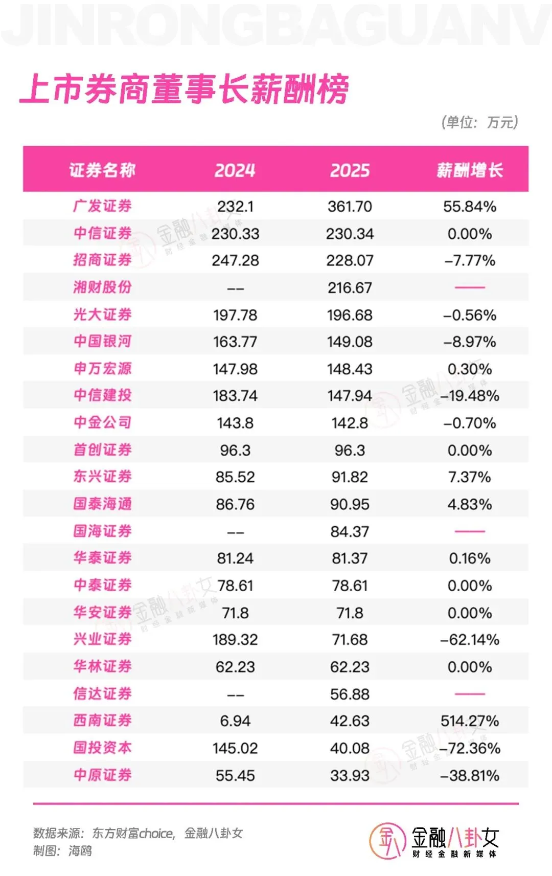 去年有8家上市券商的董事长薪酬,都和2024年基本持平(变动小于1%),变动超过20%的也只有5家: