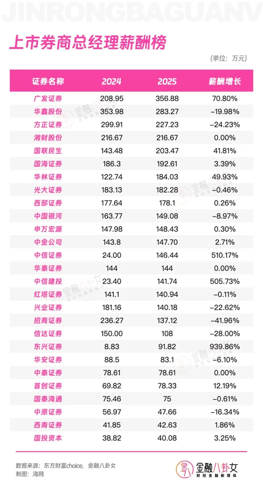 另外,去年有8家上市券商的总经理薪酬,和2024年基本持平(变动小于1%),变动超过20%的则有10家,总经理的薪酬变化幅度比董事长更大,涨薪居多: