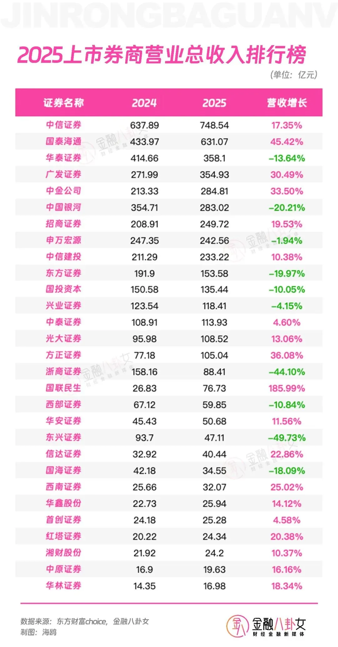 营收最高的中信证券总营收748亿和国泰海通631亿,两家断崖式领先其他券商。华泰和广发都在350亿多紧随其后,中金和银河都是280亿,也咬得很紧,真是你追我赶。