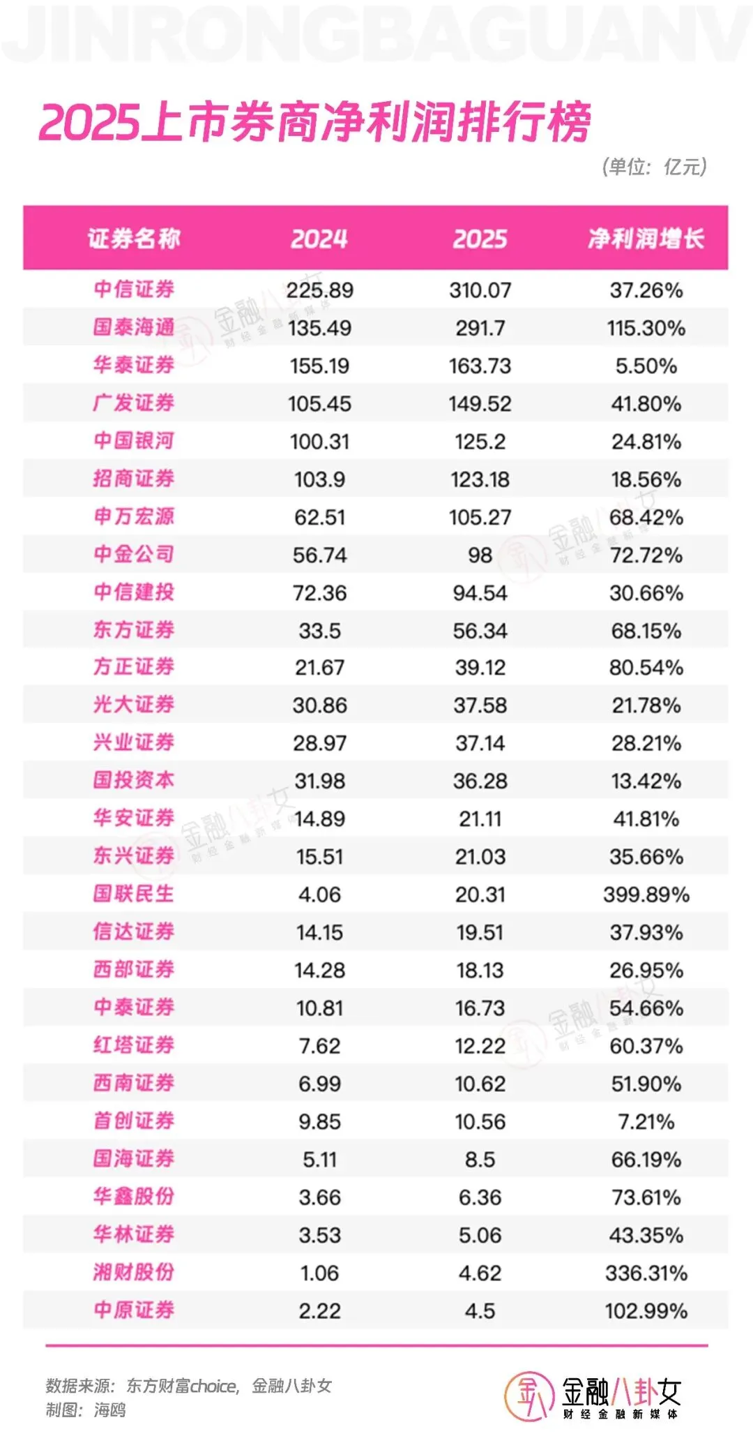 净利润增速比营收大得多。从净利润排名看,中信和国泰海通断崖领先,中信是310亿,国泰海通是291.7亿,再往后净利润就都低于200亿。
