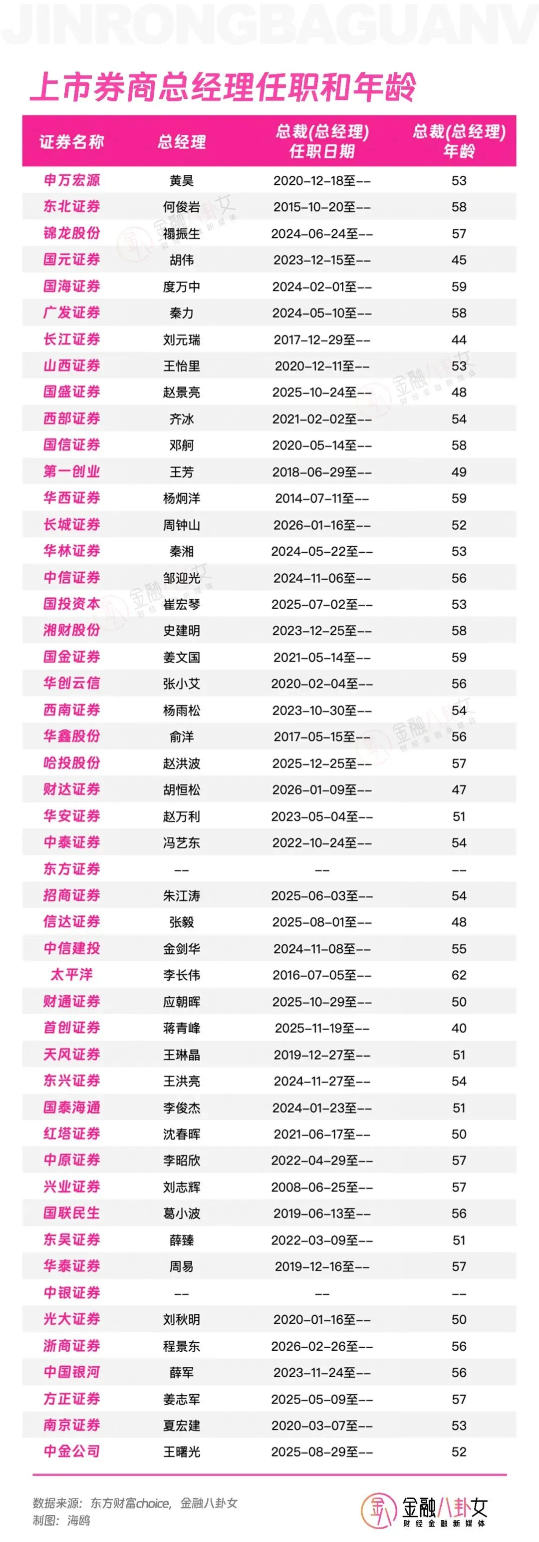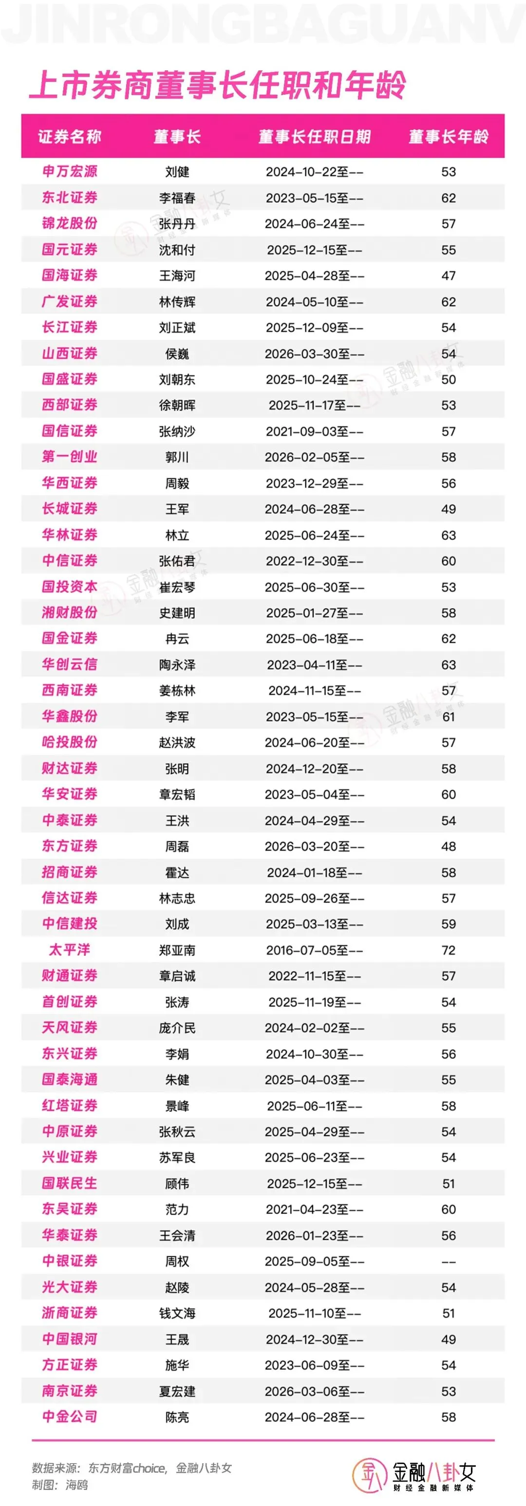 以董事长为例,49家上市券商当中,有14家的董事长是2024年上任的,19家是2025年上任,还有5家是今年上任,大多数都是近三年上来的,并且除了太平洋的郑亚南是2016年任职之外,其他董事长都是2020年之后任职的。