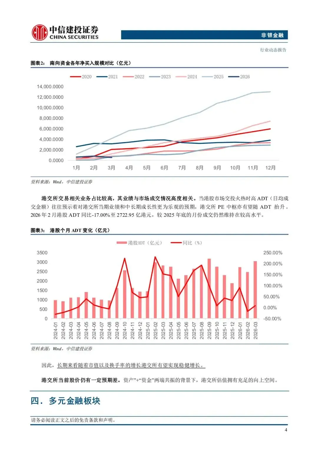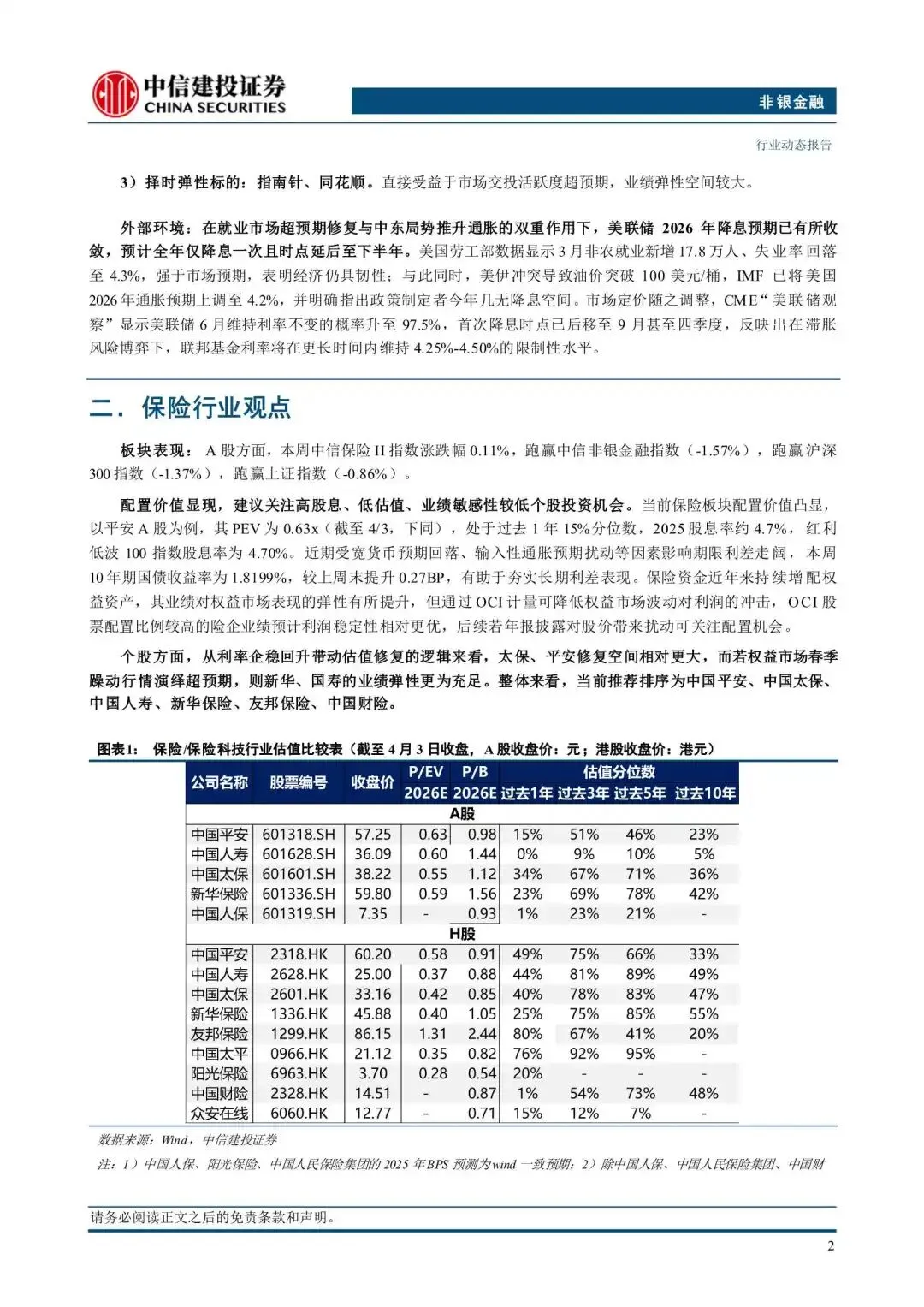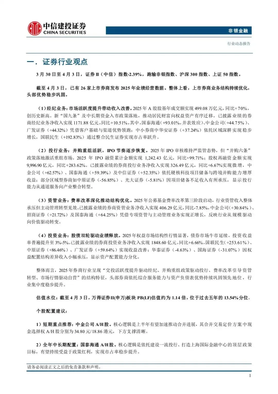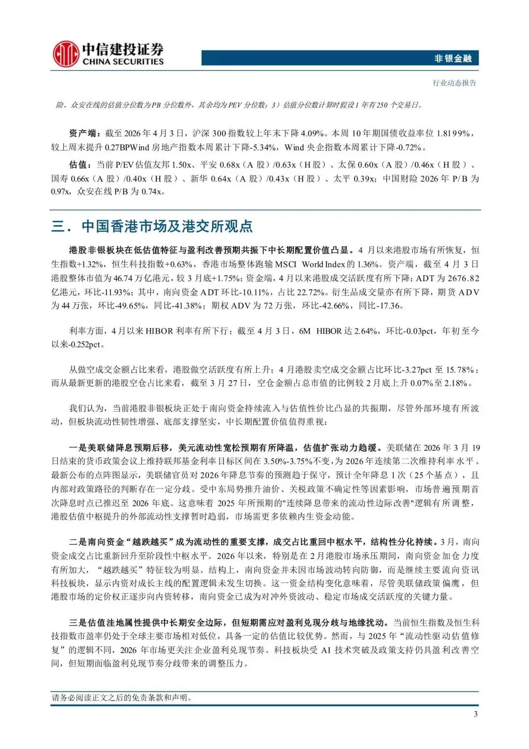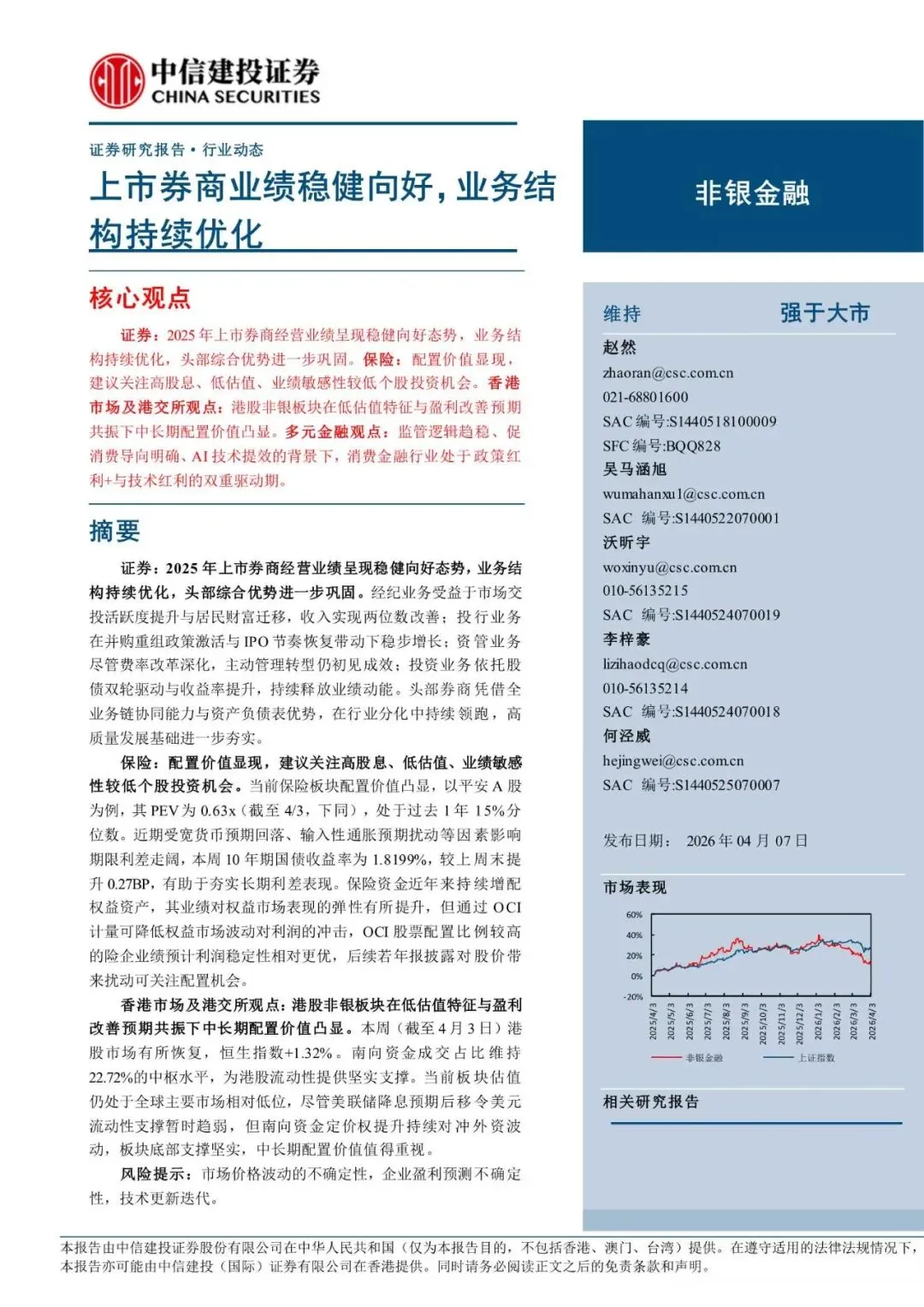 证券:2025 年上市券商经营业绩呈现稳健向好态势,业务结构持续优化,头部综合优势进一步巩固。保险:配置价值显现,建议关注高股息、低估值、业绩敏感性较低个股投资机会。香港市场及港交所观点:港股非银板块在低估值特征与盈利改善预期