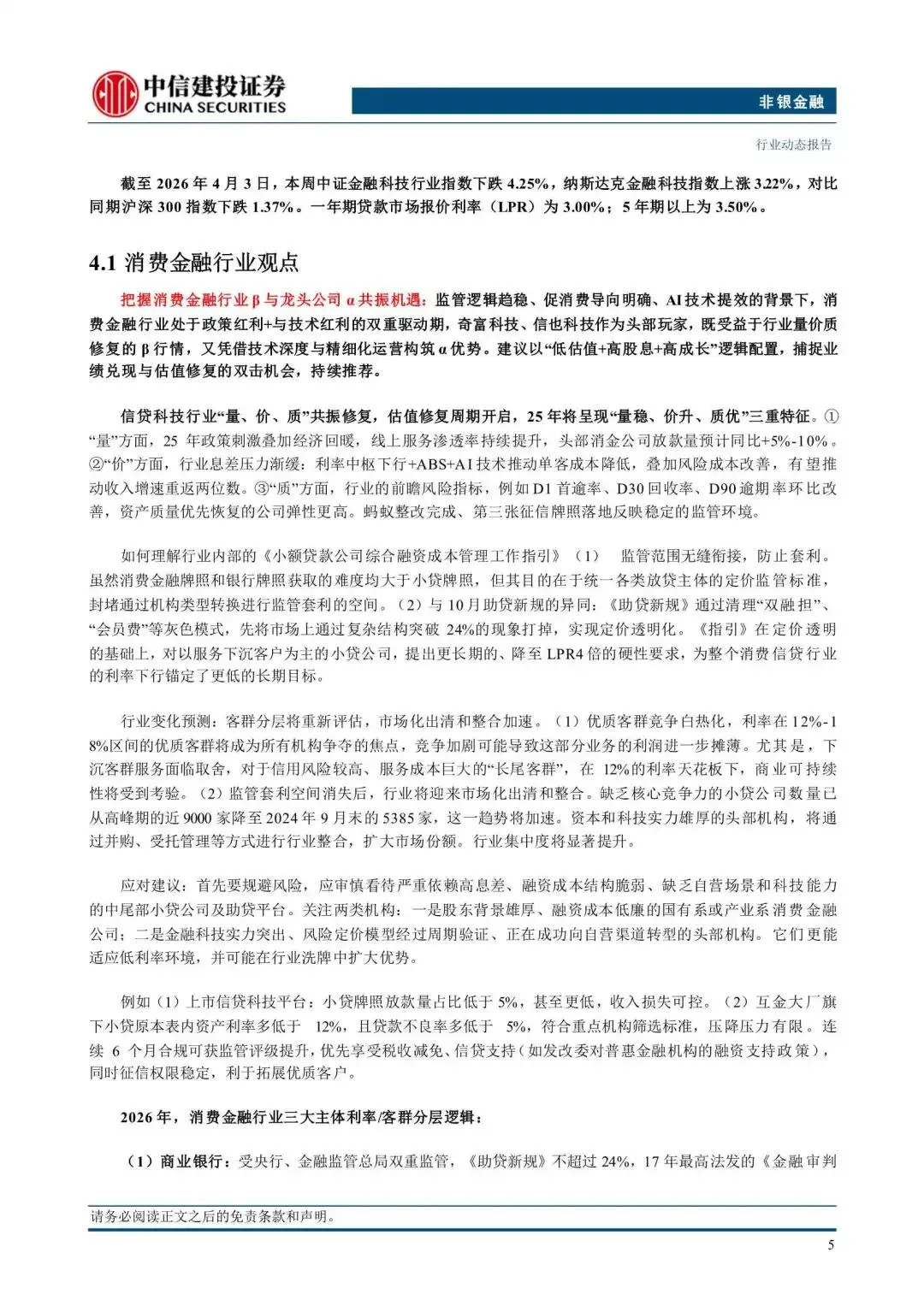 共振下中长期配置价值凸显。多元金融观点:监管逻辑趋稳、促消费导向明确、AI 技术提效的背景下,消费金融行业处于政策红利+与技术红利的双重驱动期。