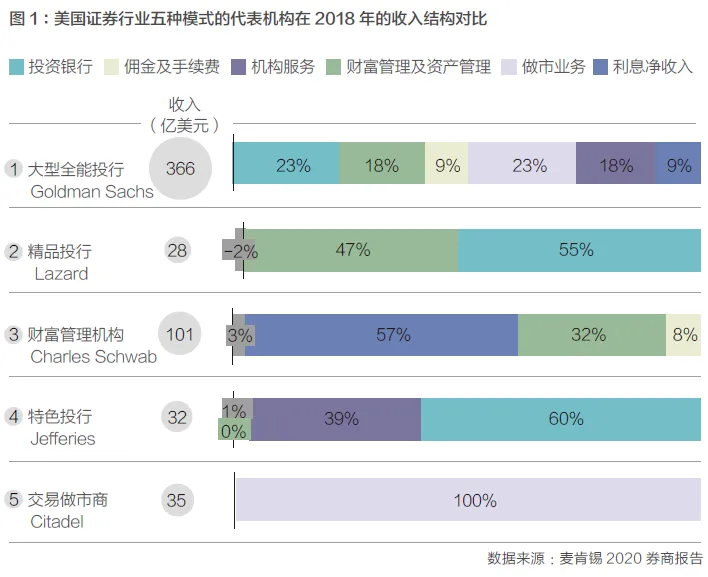 中国金融市场未来将进入资产管理和财富管理大爆发的时代。从资金性质来看,市场上有散户、高净值个人、险资、企业年金、养老金、社保资金等多种不同性质的资金,对收益和风险波动有着不同的要求。在大资管时代,市场需根据投资者的收益和风险偏好来进行客户分档,寻找适宜的解决方案,对接合适的资产。这个市场上需要多种角色的参与:公募、私募、券商、险资资管等不同类别的高水平资产管理人;多种不同的策略,比如CTA(商品交易顾问)、Alpha、行业和风格基金、绝对收益、固收+等;数据和分析工具的提供方;有效的回测平台和交易平台;还有一大类需求是投顾角色,建立产品和管理人的库,进行精细的风格分析,为投资人匹配合适的基金经理。随着市场对工具和流动性的需求增大,作为市场中介的券商业务将会更受重视。根据麦肯锡2020年券商报告,在美国市场上,券商分为五大类:(1)大型全能投行,以高盛和摩根大通为代表,聚焦在重资本业务上,收入高度多元化,投资银行、资产管理、机构业务、经纪业务等全面开花,属于巨无霸航母式券商。(2)精品投行,聚焦投融资、上市、并购重组、财务管理等咨询类业务。(3)财富管理机构,从经纪业务转型,依赖较强的渠道和投顾能力,从投资组合的管理中获得收入。(4)特色投行,可以提供较全面的产品和服务,但是回避全面竞争,重点深耕某一类客户或者某个地区。(5)交易做市商,比较专注在交易和做市业务上,是在技术和量化分析驱动下,建立了技术护城河之后参与全球各大市场的交易。