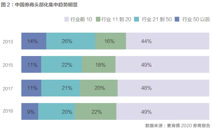目前,中国券商行业同质化和头部化比较严重。2018年,前十大券商占券商总收入的50%,剩下100多家总收入占另外50%。从净利润看,2018年,前10家占据87%,很多中后部券商亏损。随着市场开放,越来越多的外部优秀券商机构进入中国,给中国券商行业带来更大竞争压力。未来,中国本土券商可能会通过不断整合,诞生一批头部航母式巨无霸券商,而一些中小型券商可能转向开发独特的特色业务,做市商业务可能是其中一个选项。