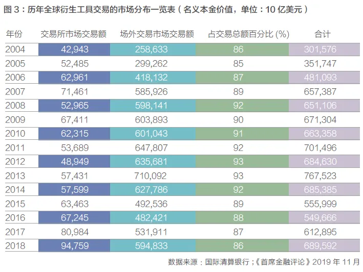 金融产品通常有两类交易渠道。对于标准化的产品,可以在交易所直接买卖撮合交易 ;对于个性化的、结构化的产品, 不便于在交易所直接撮合,更多是需要在场外柜台(OTC)市场中进行询价和成交。根据国际清算银行(BIS)统计数据,2014-2018年,衍生品场外交易占总交易量的85%-95%,远高于场内交易量。2018年全球场外衍生品存量规模为544万亿美元,其中,利率衍生品高达 437万亿美元,占比80%;其次是外汇衍生品,约为91万亿美元,占比17%;股票衍生品约为6.5万亿美元,占比2%。