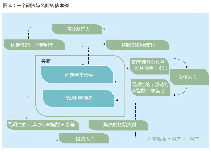 在OTC市场,做市商起到非常重要的流动性提供者作用。券商实时提供买卖双边报价,如果交易对手接受这个价格,做市商有义务进行成交。并且,做市商资格要求每个月的做市时间占总的市场开放时间比例有最低要求,以维护所做市产品的市场流动性。做市商的基本获利手段是赚取买卖价差,作为提供市场流动性的回报。做市商面临的第一个核心问题是如何进行产品报价。市场上流动性较高的产品,例如短期的价上欧式期权(所谓锚点产品),交易活跃,市场价格比较透明;流行性相对较弱的非锚点产品,例如某些价内或者价外期权,如何进行合理的报价,并且不因为报价不合理被别人套利。理想的做市商模式是把买入卖出的净头寸做平,买入和卖出头寸相抵,不留净头寸,没有风险敞口,从而稳健地获取买卖价差。一个做平头寸的典型案例:假设券商买入一个固息债券,则定期收到固定利率的利息,同时会受到债券价格波动的影响,会有资本利得。为了控制风险,券商先找到一个投资人,发行一个浮动利率的债券(浮动利率+息差1);再找到第二个投资人进行一个全收益的互换,把固息债的资本利得和利息全都给投资人2,投资人2给券商一个浮动的利率+息差2。在这一过程中,券商资金支付相抵消,浮动利率相抵消,只剩收到的息差2减去支出的息差1,如果息差2大于息差1,则整个交易结构就会成为吃净息差的套利交易(Carry Trade)。