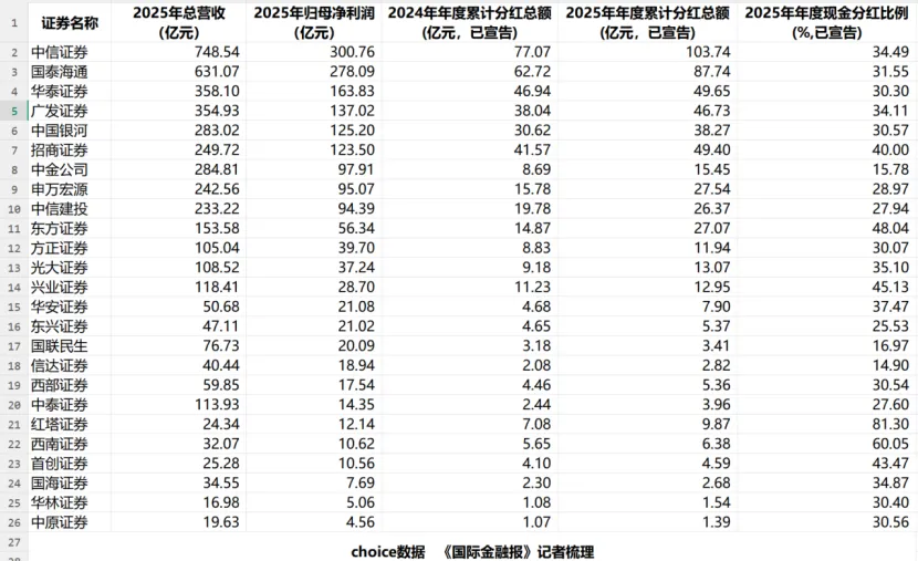 截至4月15日,25家上市券商业绩揭晓:加权平均ROE普遍提升,现金分红总额同比增厚。具体来看,中信证券以超百亿元分红领跑行业;多数中小券商分红不足10亿元,其中红塔证券派现9.87亿元,但分红比例高达81.3%。