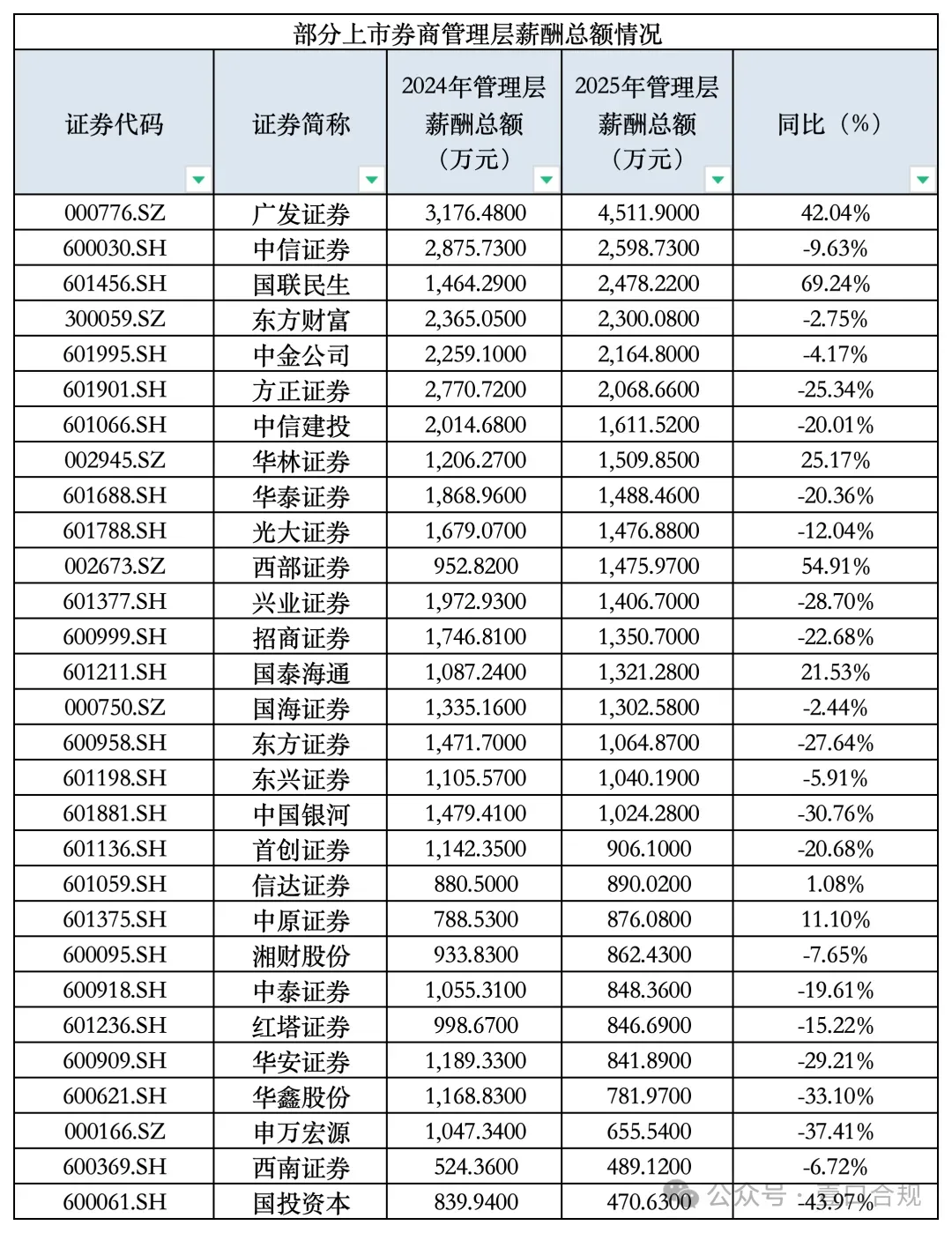 与此同时,部分券商管理层薪酬实现逆势增长。国联民生证券、西部证券、广发证券等 7 家券商管理层薪酬同比上升,其中国联民生证券增幅达 69.24%,与公司并购重组后业绩高速增长、业务整合推进直接相关。