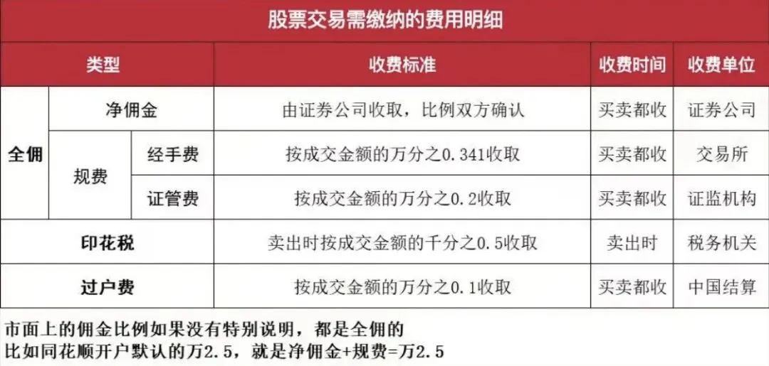 股市交易手续费不仅仅有证券公司收取的,券商也有成本的,我们平时熟悉的股票手续费比例都是包含了规费,也就是全佣的,比如说同花顺开户万2.5,现在低佣的话是全佣万一免五开户,全佣万0.85免五开户以及全佣万0.75免五开户了。