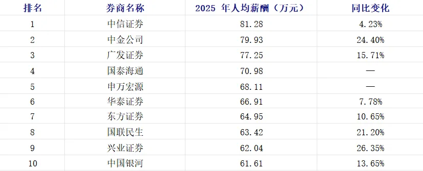 一边,头部券商薪酬人均上行。Wind数据显示,在已披露年报的券商中,中信证券以81.28万元的人均薪酬位居第一,连续四年领跑证券行业,是目前唯一突破80万元大关的机构。紧随其后的是中金,以79.93万元紧追不舍,广发证券、国泰海通分列第三、第四。