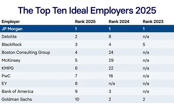 过去,“外资投行=终极梦想”几乎是留学生圈的共识。高盛、摩根士丹利、麦肯锡、谷歌等被留学生视为“挤破头都想进的梦中情司”,甚至摩根大通连续三年稳居全球金融人才最向往的雇主榜首。