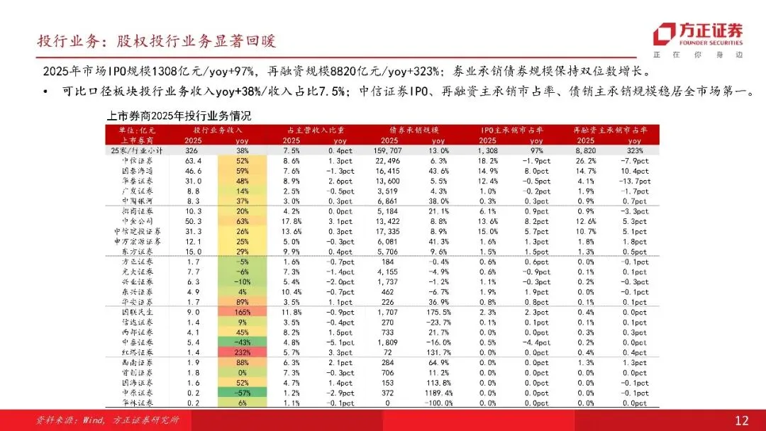 资本金业务收入yoy+30%/占比53%。权益市场上涨驱动投资收益修复,两融规模持续增长:2025投资收入(含汇兑损益)yoy+25%/收入占比42%,利息净收入yoy+49%收入占比8.4%,长腰投收入yoy+57%/收入占比2.4%。