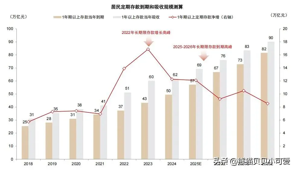 根据华泰证券研究所研报测算,今年1年以上定期存款到期规模约50万亿,较2025年增长10万亿。其中,2年期、3年期存款到期量预计均在20万亿以上,5年期大致在5-6万亿。