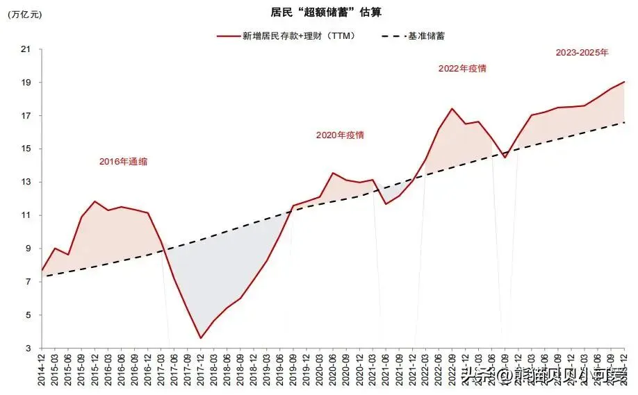 2022年~2025年期间,居民共形成了约6万亿元的超额储蓄。