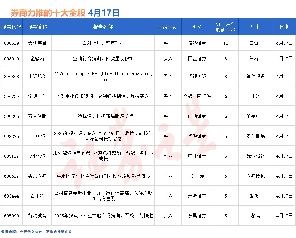 4月17日券商力推的金股名单