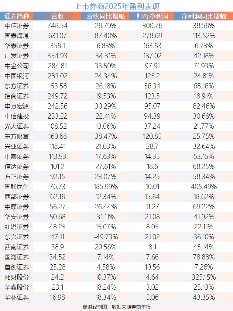 从2025年盈利情况来看,绝大部分上市券商实现了营收、净利双涨,甚至有的进入了高增长的梯队。