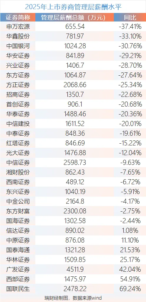 瑞财经统计的28家上市券商当中,共有21家券商管理层薪酬下滑了。其中,2025年,申万宏源管理层薪酬655.54万元,同比下降了37.41%,幅度较高。