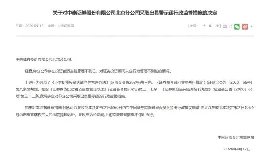 北京证监局4月15日开出最新监管罚单,中泰证券北京分公司因两项核心合规问题失守,被采取出具警示函的行政监管措施。