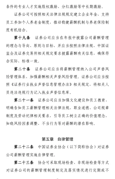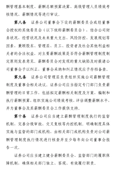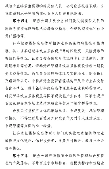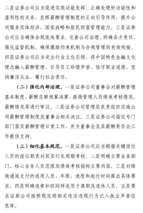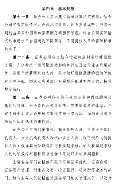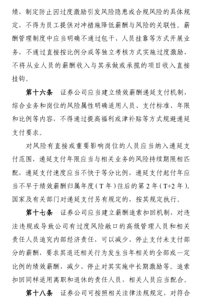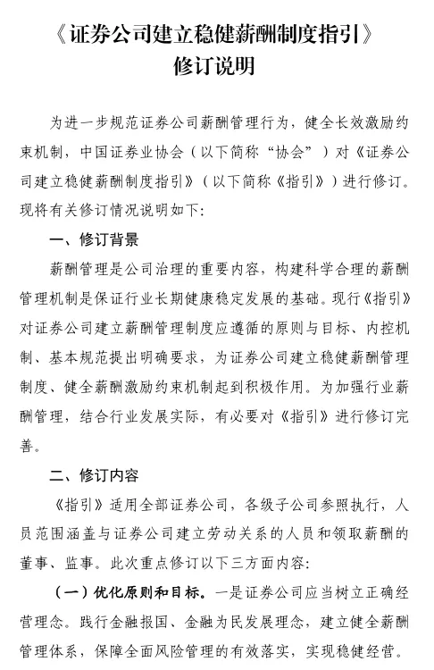 重磅!券商薪酬制度指引(修订版)近日,中国证券业协会发布《证券公司建立稳健薪酬制度指引》(2026修订版)。此次修订的总体思路,一是坚持目标导向。贯彻新“国九条”提出的“完善与经营绩效、业务性质、贡献水平、合规风控、社会文化相适应的证券基金行业薪酬管理制度”要求,进一步优化原则目标,引导证券公司建立兼顾激励与约束、效率与公平、长期与短期的薪酬管理机制。二是立足优化完善。本次修订保持总体框架不变,在董事会、管理层的职责、建立薪酬总额决定机制、递延支付适用、追索扣回方式等方面细化完善,进一步增强规则的适用性和可操作性。三是注重长期稳健。新增长周期考核要求,对主要业务部门及核心人员范围、绩效考核指标主要内容等作出具体规范要求,压实公司主体责任,强化长期激励约束机制建设。