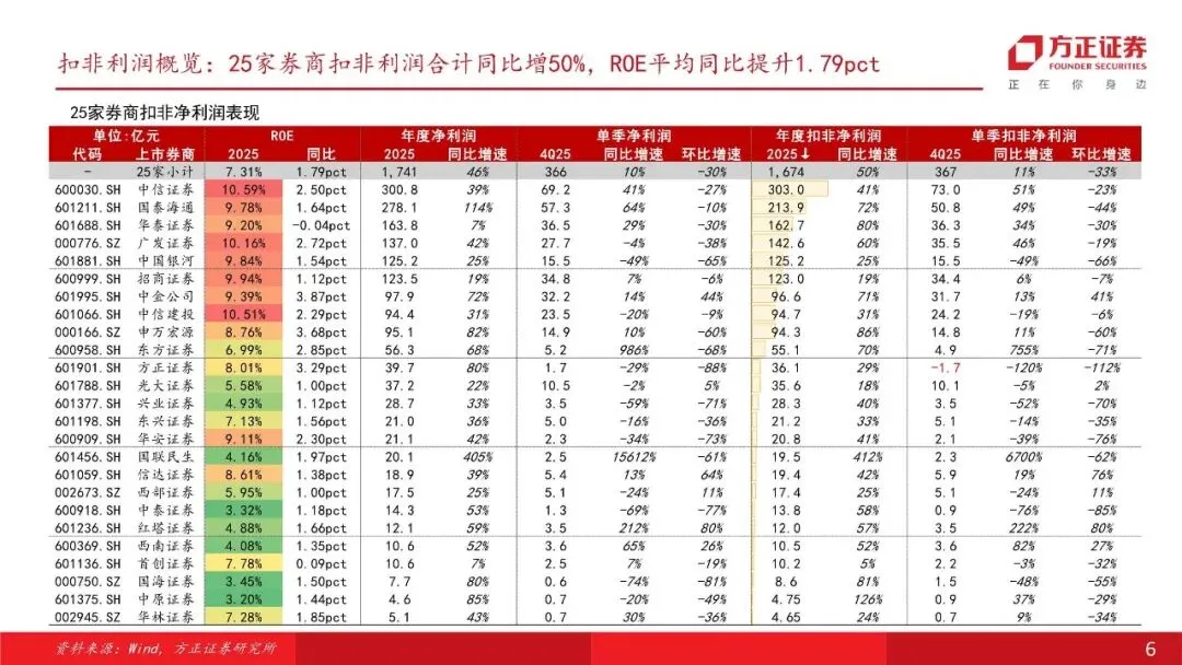 2025年券商板块合计主营收入yoy+32%,净利润yoy+46%;4Q25单季主营收入yoy+4%,净利润yoy+10%。