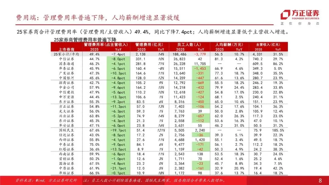 管理费用率下降;风控指标改善。板块25年管理费用率49.4%/yoy-7.4pct,人均薪酬增速显著低于主营收入增速。年末净资本双位数增长,资本杠杆率平均20.9%/yoy+0.8pct。