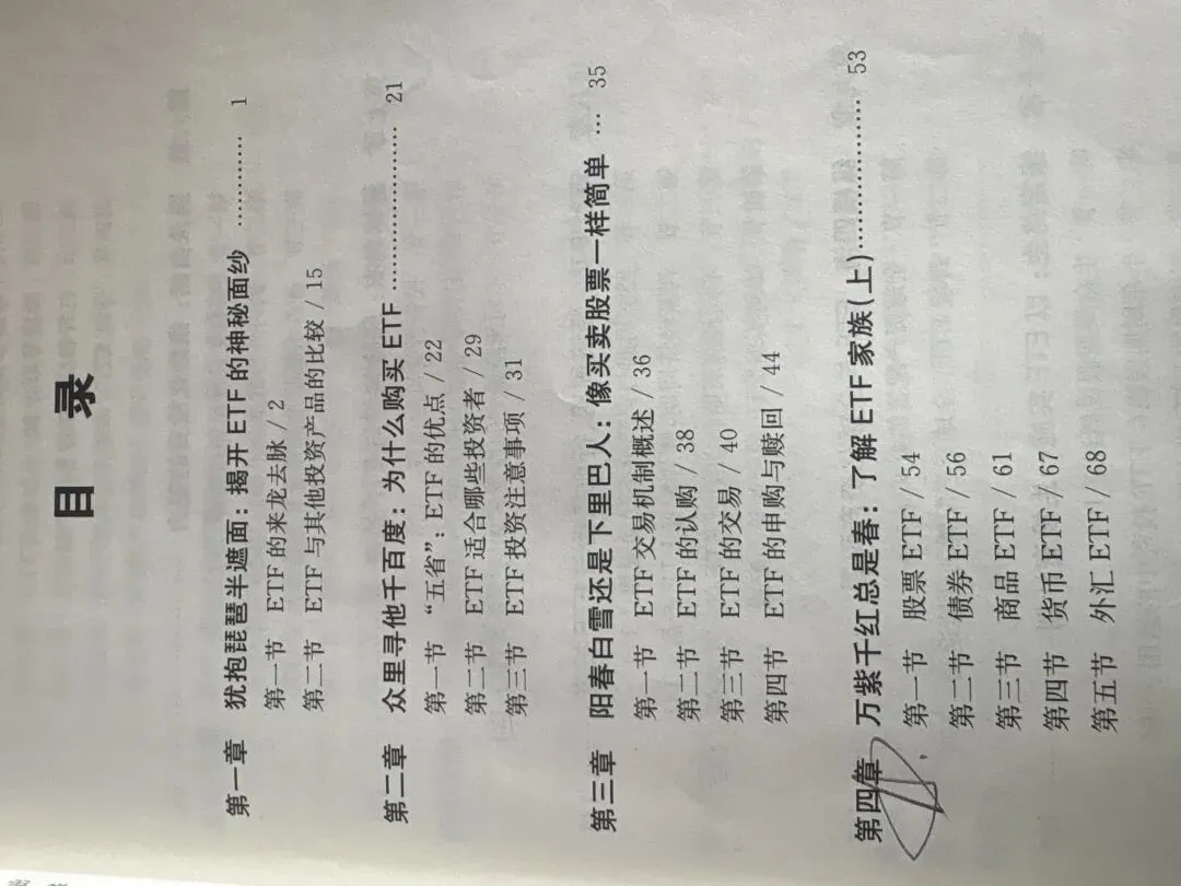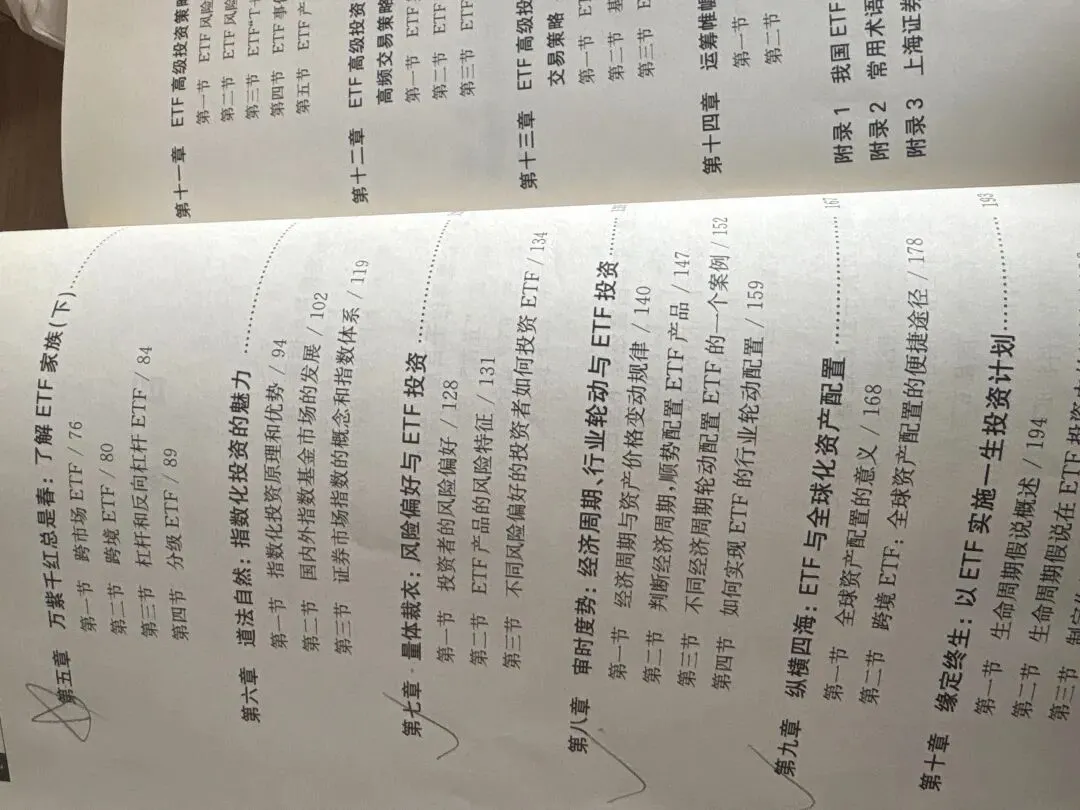 我简单看了一下目录,一共14章节,我准备重点回顾种类、风险特征、配置这三块。时间有限,等会还要去收拾鞋柜呢。ETF(Exchange Traded Fund)=交易型开放式指数基金美国是ETF数量最多、规模最大的国家。宽基指数是美国ETF市场的主要产品。(tip:宽=覆盖多,基=base=大盘,宽基就是买大类市场、覆盖面很广、流动性很好的指数基金。)ETF可以解决选股的难题,避免只赚指数不赚钱的尴尬。ETF可参与的板块非常多,股票、债券、货币、外汇、商品等等,股票etf和商品etf值得我们关注。(很多年之前,是有分级a与分级b份额的,我记得那时候我还做过分级ab的合并拆分,这里面是有点无风险套利空间的。分级就是类似优先级劣后级的意思,前者拿固收+收益,后者拿超额并承担风险。2018年之后分级基金加强监管了,这部分就没了。)库存周期、资本支出周期、房地产周期,如果按照发现者命名的话,分别为基钦周期、朱格拉周期、库兹涅茨周期。股票ETF可以采用核心-卫星策略,在重点持有宽基股票ETF的同时,小部分持有各类行业ETF。债券ETF可以选择国债ETF或企业债ETF,取决于投资者对经济状况的预期。选择企业债ETF,尤其是高收益债,一般是对经济状况非常看好;在经济进入滞涨段时选择通胀保值债券是最合适的。❤️❤️❤️今天就学到这了,喜欢我就请给我星标🌟+点赞👍+打赏💰感谢屏幕前最可爱的您陪我到这里🙏么么哒💋~