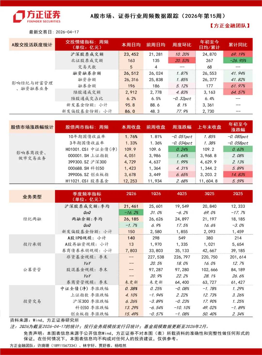 A股市场、证券行业周频数据跟踪(2026年第15周):