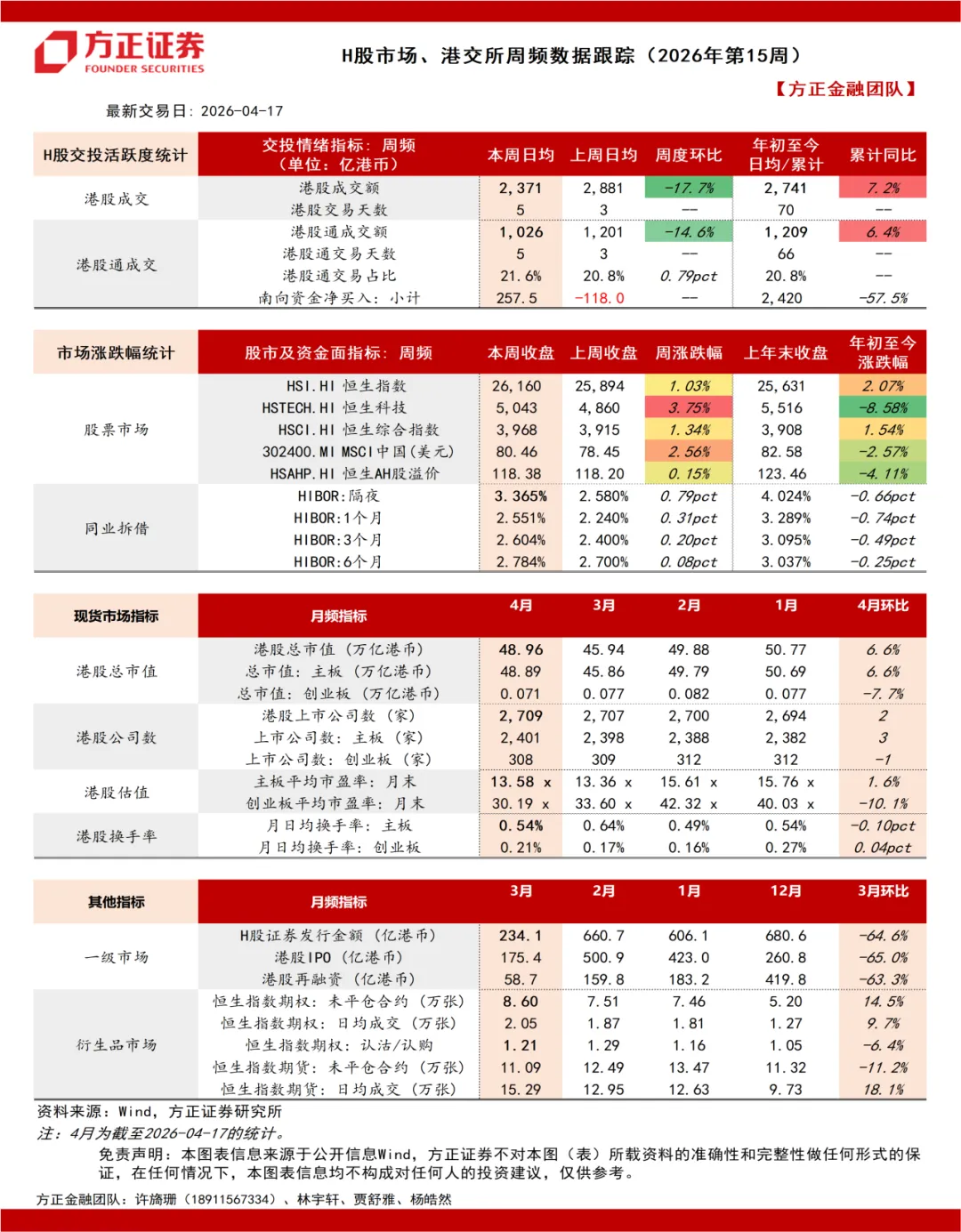 H股市场、港交所周频数据跟踪(2026年第15周):