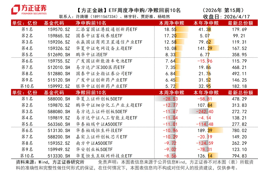 2. 周净申购前3名ETF:汇添富国证港股通创新药ETF (+18.6亿份)、国泰中证畜牧养殖ETF (+17.2亿份)、永赢国证商用卫星通信产业ETF (+12.6亿份)。