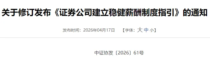 2026年4月17日,中国证券业协会修订发布了《证券公司建立稳健薪酬制度指引》(以下简称《指引》),这是该文件自2022年发布后的首次全面修订。