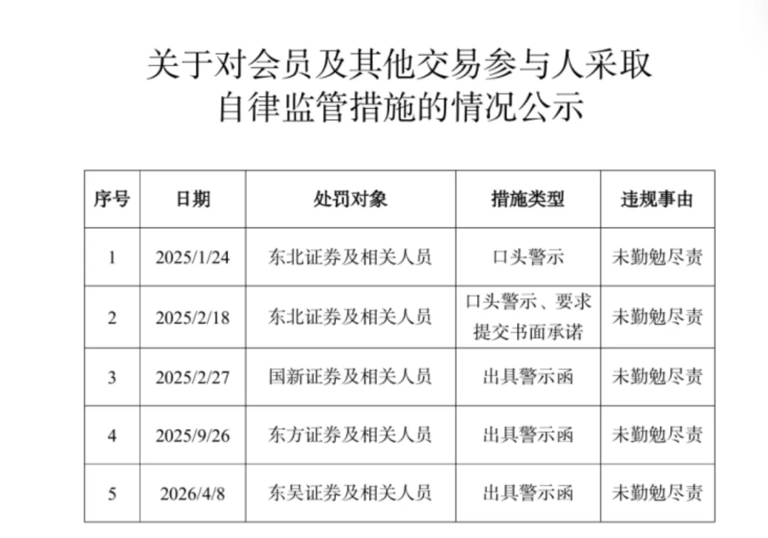 此后,国新证券(2025年2月)、东方证券(2025年9月)、东吴证券(2026年4月)也分别因未勤勉尽责,被北交所出具警示函。