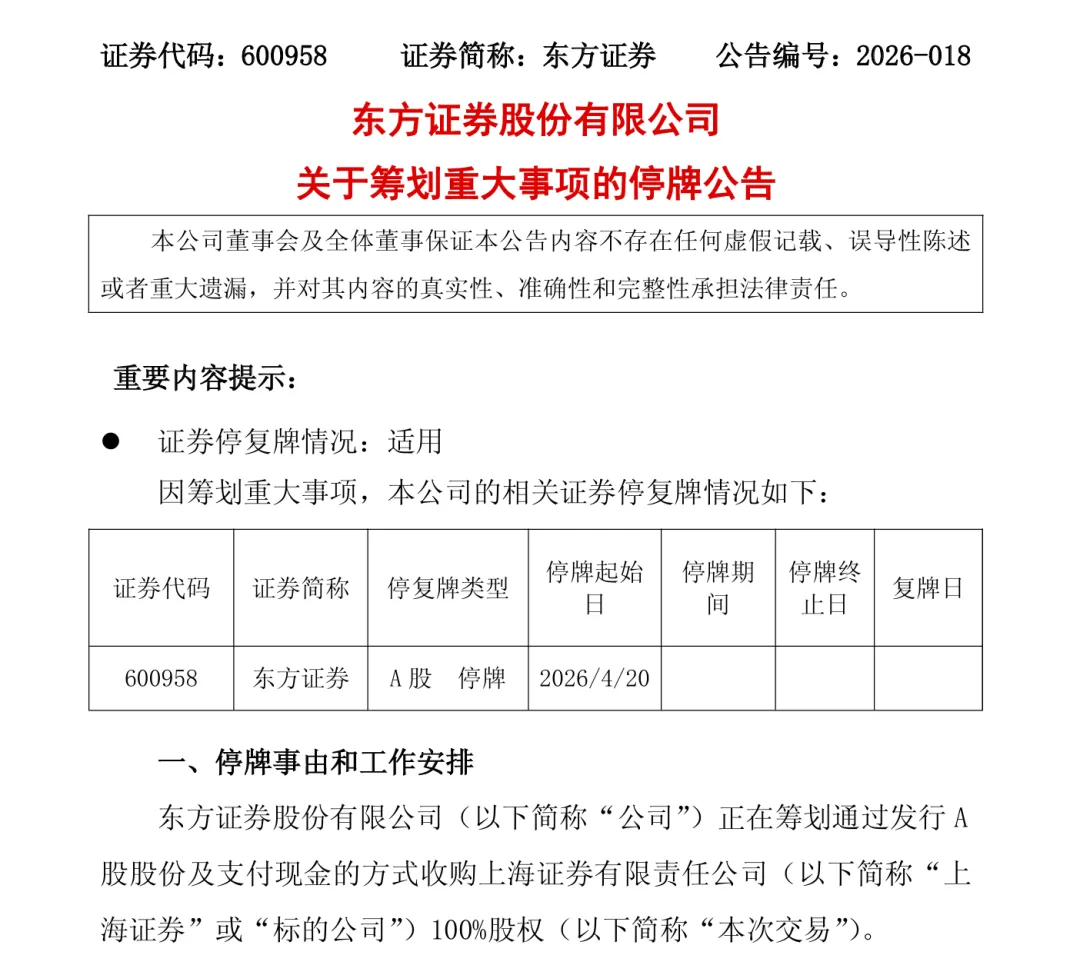 鉴于上述事项存在不确定性,为保证公平信息披露,维护投资者利益,避免造成股价异常波动,根据上交所的相关规定,经申请,东方证券将于4月20日开市起停牌,预计停牌时间不超过10个交易日。