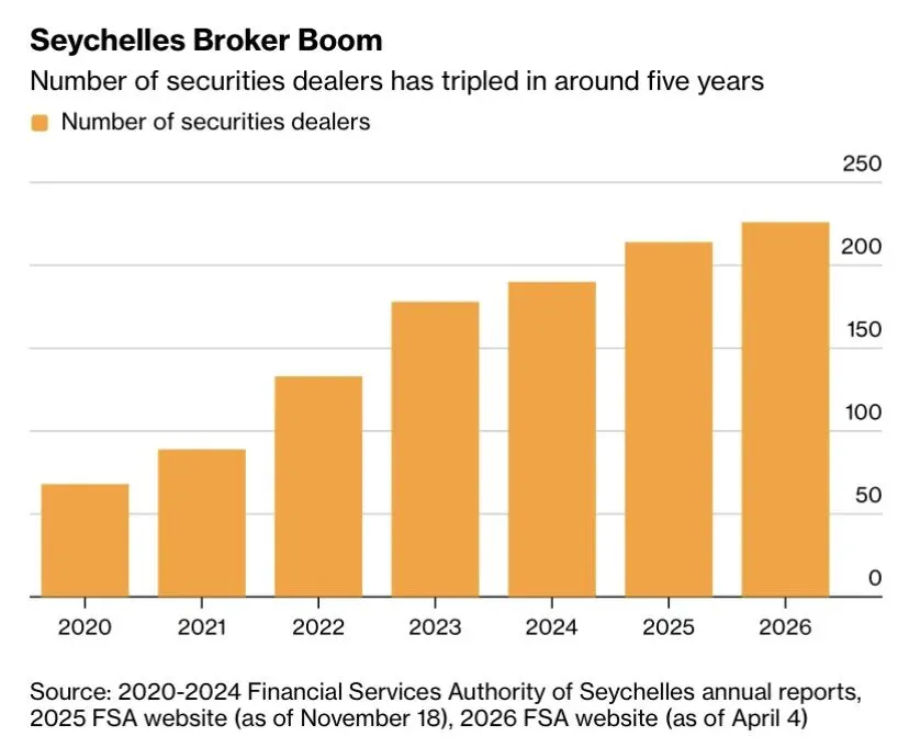 这片印度洋上的群岛,正处于全球金融外包浪潮的中心。大量互联网券商正涌入这里,原因非常现实:低税率、对员工配置要求极低、公司注册极快,而且最关键的是——监管对高风险交易几乎持开放态度。在全球越来越多司法辖区开始限制散户杠杆交易的背景下,塞舌尔的证券经纪商数量在大约五年内已经翻了三倍,超过220家。