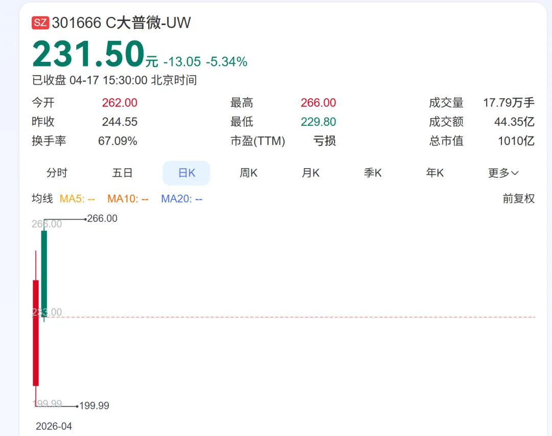 4月16日,创业板首家未盈利企业大普微敲钟上市,发行价46.08元,首日收盘244.55元,暴涨430.71%,总市值直接冲上1066.77亿元。全网最炸的不是新股赚10万,而是公司副总兼董秘朱劲松,靠早期120万出资,持股市值飙到27.27亿,5年收益翻2270倍。