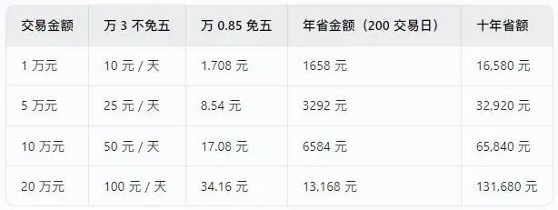 我有个体量千万的客户,每天做T倒腾两三百万持仓,约200笔交易,每笔2万上下。原先券商不免5,换成“万0.85免五”的券商后,每笔单子能节省手续费近3.3元,一天累计省600多元,一年按252个交易日算,能省近15万元。