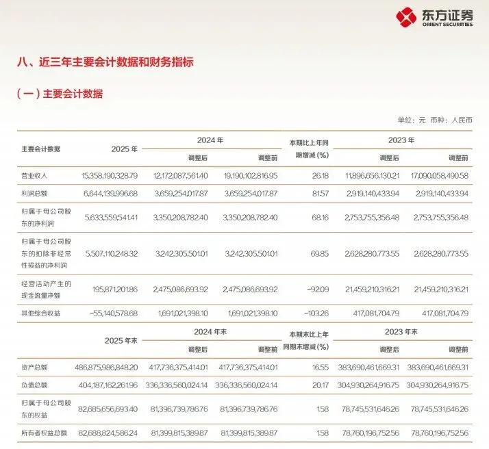 据东方证券2025年年报,截至2025年末,东方证券总资产为4868.75亿元,较上年末增长16.55%;归属上市公司所有者的权益为826.85亿元,较上年末增长1.58%。经营业绩方面,2025年,东方证券实现营业收入153.58亿元,同比增长26.18%;归属于上市公司股东的净利润56.33亿元,同比增长68.16%。(文峰)