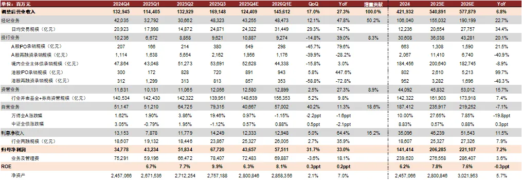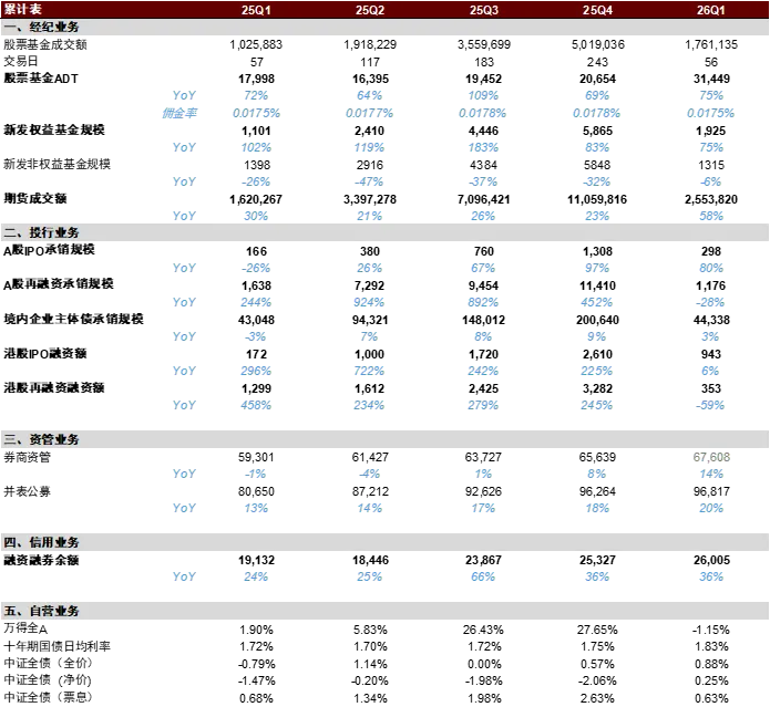我们预计1Q26业绩高增主要得益于权益市场1-2月的高景气与固收市场的同比回暖。1)1Q26市场日均股基成交额同比+75%至3.1万亿元,我们预计驱动经纪业务高增;同时1-2月权益市场整体偏暖,万得全A涨跌幅为+8%,给权益客需业务(尤其是跨境北向收益互换)和权益自营业务带来机会,而3月市场震荡对1Q整体业绩略有拖累,1Q万得全A累计涨跌幅下滑至-1%。此外,两融、资管和一级市场的投行、直投、另类投资也部分受益于二级权益市场的支撑。2)1Q26利率略有下行下中证全债(净价)涨幅为0.25%,驱动固收自营同比有所回暖,但考虑到1Q25部分券商兑现了其他债权投资的部分积累的浮盈,我们预计固收自营增长或略乏力。