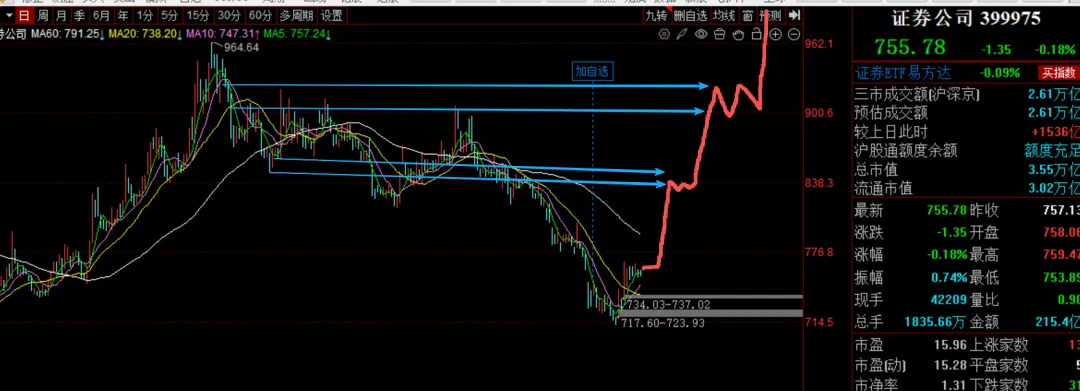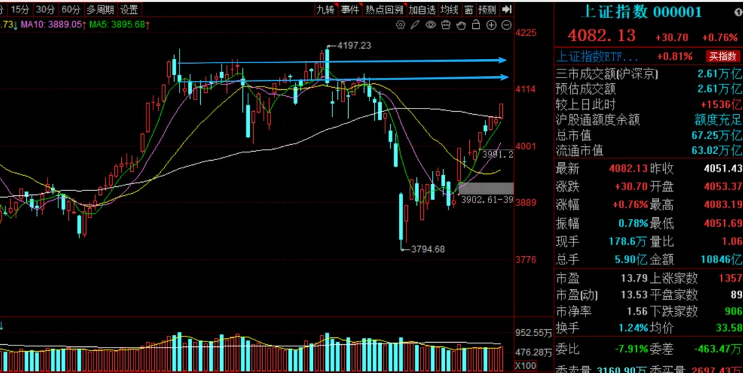 大盘上攻 券商盘整今天大盘继续上涨,也放量了1500多亿。市场走势非常强势。券商此时还在盘整,给人一种不涨的感觉。中信证券受到60线的压制只要大盘继续上涨,我不担心,券商不跟。只是券商的特性要么不涨,要么猛涨2-3天跟上。理想的情况就是这样,在新高之前,涨一涨然后震荡,让一部分前面的人解套。 最后的一波再来一个极速上攻,最后一波有没有可能需要外部条件刺激,所以不确定大一些。大盘到4200的时候,第一段上涨完成。目前来看,大盘到4200,券商这个位置应该能涨个8%左右。现在大盘太强了,都不调整的上涨,这样涨下去,月底前就能看到4200?我认为这两个箭头区间大概率要调整,前面筹码交换才行。目前创业板 深成指新高。 中证A500 还有0.7%就新高了,沪深300还有1.67%新高。