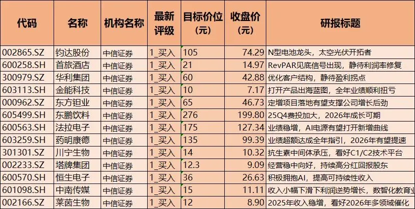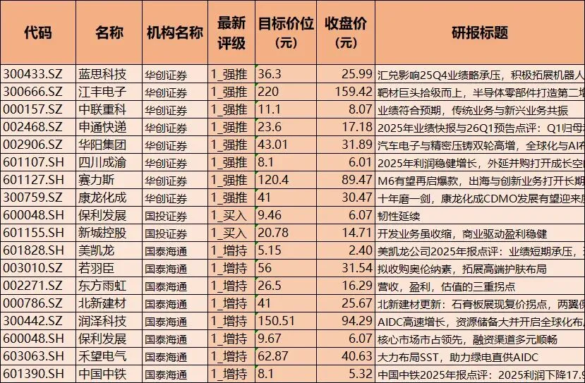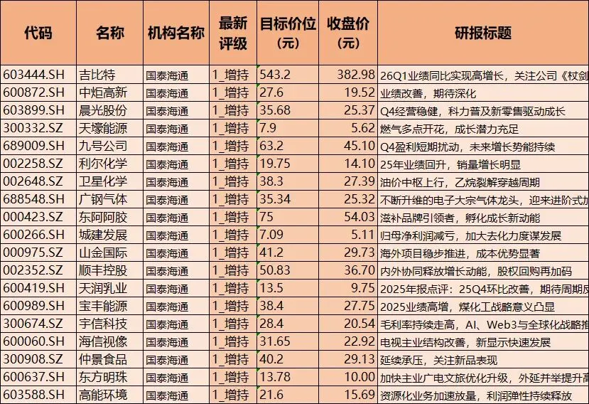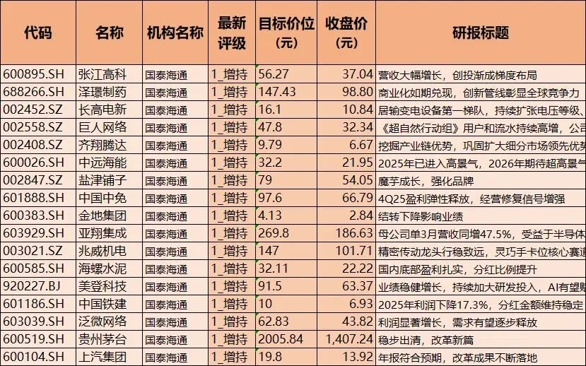 国泰海通给出增持的股票有张江高科(评价理由为营收大幅增长,创投渐成梯度布局,目标价超56元)、泽璟制药(评价理由为商业化如期兑现,创新管线彰显全球竞争力),以及长高电新、巨人网络等。