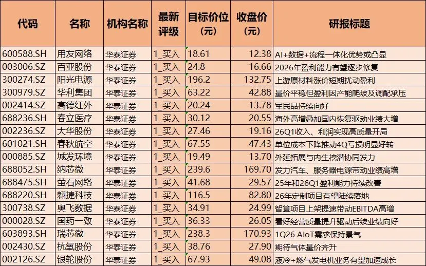 用友网络为国内企业管理软件提供商,因其AI+数据+流程一体化优势,华泰证券在近期给出买入评级;国内红外热成像龙头高德红外,军民品持续向好,主营产品为红外探测器及整机系统,华泰证券给的股票目标价为20.24元。