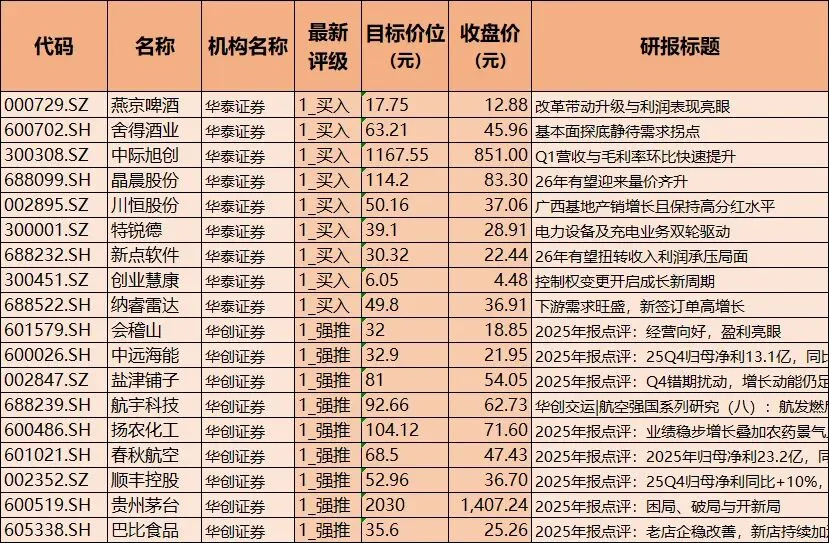 蓝思科技是消费电子外观防护龙头,提供玻璃盖板、蓝宝石视窗及金属结构件,并积极拓展机器人、AI服务器、商业航天新赛道,华创证券给出强推评级,目标价超36元。华创证券给出的其他高评级个股包含江丰电子(国内高纯溅射靶材龙头)、中联重科、申通快递等。