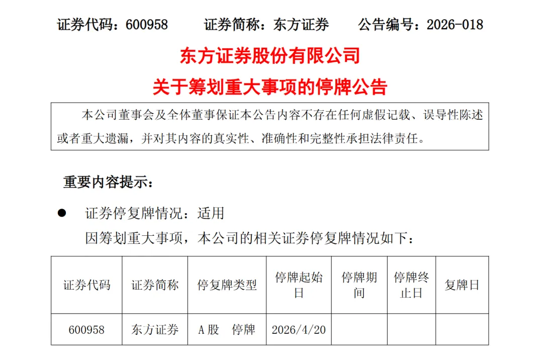 4月19日下午,东方证券发布停牌公告,称正在筹划通过发行A股股份及支付现金的方式收购上海证券有限责任公司100%股权,A股股票于4月20日开市起停牌,预计不超过10个交易日。停牌期间,东方证券H股将继续在港交所正常交易。